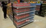 Karyawan menata produk makanan di Transmart Cempaka Putih, Jakarta, Senin (2/1/2023). Badan Pusat Statistik (BPS) mencatat inflasi Desember 2022 sebesar 0,66% secara bulanan (month to month/mtm) dan tahunan 5,51% (year on year/yoy). Inflasi Desember disumbang oleh makanan, minuman, dan tembakau. Republika/Prayogi. (FOTO : Republika/Prayogi)