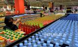 Karyawan menata produk minuman di Transmart Cempaka Putih, Jakarta, Senin (2/1/2023). Badan Pusat Statistik (BPS) mencatat inflasi Desember 2022 sebesar 0,66% secara bulanan (month to month/mtm) dan tahunan 5,51% (year on year/yoy). Inflasi Desember disumbang oleh makanan, minuman, dan tembakau. (FOTO : Republika/Prayogi)
