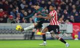 Darwin Nunez menggocek bola dibayangi Ethan Pinnock pada laga antara Brentford FC melawan Liverpool FC di Brentford, Inggris, Selasa (3/1/2023). (FOTO : EPA-EFE/Kieran Galvin )