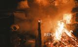Seorang penyelamat mencoba memadamkan api gedung penembakan Rusia di desa Ivanivka dekat Bakhmut di daerah Donetsk, Ukraina, (2/1/2023) di tengah invasi Rusia. Pertempuran sengit terjadi di daerah tersebut sejak serangan Rusia pada November 2022. Warga Bakhmut masih harus hidup tanpa pemanas, listrik, dan gas karena pengeboman terus menerus oleh Rusia. Pasukan Rusia memasuki Ukraina pada 24 Februari 2022 memulai konflik yang memicu kehancuran dan krisis kemanusiaan. (FOTO : EPA-EFE/GEORGE IVANCHENKO)
