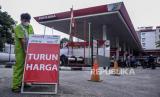 REPUBLIKA.CO.ID,JAKARTA -- Petugas membawa papan sosialisasi penurunan harga BBM di salah satu SPBU di kawasan Senen, Jakarta, Selasa (3/1/2023).