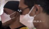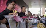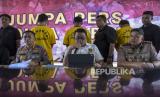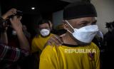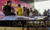 REPUBLIKA.CO.ID,BANDUNG -- Petugas kepolisian menggiring sejumlah tersangka saat ekspose pengungkapan kasus jual tanah aset desa di Mapolda Jabar, Jalan Soekarno Hatta, Kota Bandung, Kamis (5/1/2023).