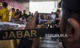 Jurnalis mengambil gambar suasana ekspose pengungkapan kasus jual tanah aset desa di Mapolda Jabar, Jalan Soekarno Hatta, Kota Bandung, Kamis (5/1/2023). Direktorat Reserse Kriminal Khusus (Ditreskrimsus) Polda Jabar berhasil mengungkap kasus penjualan tanah aset desa seluas 4,7 hektare di Desa Cibogo, Kabupaten Bandung Barat dan mengamankan empat orang tersangka yakni MS selaku mantan Kepala Desa (Kades) Cibogo, AS selaku Kades Cibogo, AY Sekretaris Desa Cibogo, DSH selaku pihak ahli waris fiktif. Kasus tersebut merugikan negara sebesar Rp30 miliar. (FOTO : ABDAN SYAKURA/REPUBLIKA)