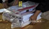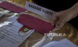 Petugas kepolisian merapikan barang bukti saat ekspose pengungkapan kasus jual tanah aset desa di Mapolda Jabar, Jalan Soekarno Hatta, Kota Bandung, Kamis (5/1/2023). Direktorat Reserse Kriminal Khusus (Ditreskrimsus) Polda Jabar berhasil mengungkap kasus penjualan tanah aset desa seluas 4,7 hektare di Desa Cibogo, Kabupaten Bandung Barat dan mengamankan empat orang tersangka yakni MS selaku mantan Kepala Desa (Kades) Cibogo, AS selaku Kades Cibogo, AY Sekretaris Desa Cibogo, DSH selaku pihak ahli waris fiktif. Kasus tersebut merugikan negara sebesar Rp30 miliar. (FOTO : ABDAN SYAKURA/REPUBLIKA)