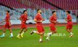 Pemain Timnas Indonesia melakukan sesi latihan di Stadion Utama Gelora Bung Karno, Senayan, Jakarta, Kamis (5/1/2023). Babak semifinal leg pertama piala AFF 2022 antara Indonesia melawan Vietnam akan berlangsung pada Jumat (6/1/2023). Pelatih Timnas Indonesia Shin Tae-yong menjanjikan permainan yang keren kepada para suporter saat skuad Garuda menghadapi Vietnam nanti. Republika/Prayogi (FOTO : Republika/Prayogi.)
