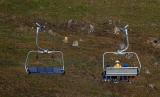 Pemain ski duduk di lift kursi membawa mereka ke atas bukit tanpa salju di Filzmoos, Austria, Kamis (5/1/2023). Sejumlah negara di Eropa mengalami suhu terhangat di bulan Januari. (FOTO : EPA-EFE/Christian Bruna)