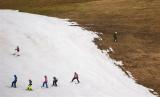 REPUBLIKA.CO.ID,JAKARTA -- Pemain ski menuruni lereng bersalju di lereng bukit yang tidak bersalju di Filzmoos, Austria, Kamis (5/1/2023).