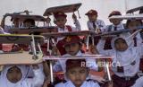 Siswa terpaksa belajar di tenda darurat karena bangunan sekolahnya terancam roboh..