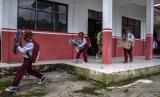 Sejumlah siswa berjalan menuju tenda darurat untuk mengikuti kegiatan belajar mengajar saat hari pertama masuk sekolah di halaman SDN Citamiang, Jalan Loji, Pacet, Kabupaten Cianjur, Senin (9/1/2023). Sebanyak 262 siswa terpaksa belajar di tenda darurat pada hari pertama masuk sekolah karena bangunan sekolahnya terancam roboh akibat gempa bumi. (FOTO : ABDAN SYAKURA/REPUBLIKA)