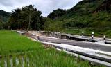 Kondisi jalan ambles di Srikeminut, Sriharjo, Bantul, Yogyakarta, Selasa (10/1/2023). Jalan sepanjang 50 meter di lokasi wisata Srikeminut, Sriharjo ambles hampir 1,5 meter imbas banjir. Padahal jalan ini baru selesai diperbaiki dan sudah beberapa kali terjadi. Imbasnya jalan saat ini hanya bisa dilewati kendaraan bermotor dan harus hati-hati. Rencananya untuk perbaikan, Pemkab Bantul akan menggandeng pakar geologi untuk cara perbaikan yang tepat. (FOTO : Republika/Wihdan Hidayat)
