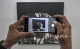Pengunjung mengmbil gambar karya seni yang dipajang pada pameran seni bertajuk Metamorfora di Galeri Ruang Dini, Jalan Anggrek, Bandung Wetan, Kota Bandung, Selasa (10/1/2023). Pameran seni gabungan instrumen fotografi dan lukisan karya seniman Carla Agustian tersebut menampilkan karya seni yang mengusung tema renungan dan kondisi ruang sosial kehidupan saat ini. Pameran tersebut berlangsung hingga 29 Januari mendatang. (FOTO : ABDAN SYAKURA/REPUBLIKA)