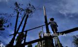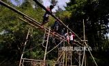 Warga bergotong-royong membangun jembatan darurat bambu di Karangtengah, Kecamatan Imogiri, Bantul, Yogyakarta, Rabu (11/1/2023). Warga terpaksa membangun jembatan darurat dari bambu usai jembatan permanen Pucungrowol ambrol. Jembatan darurat ini dibangun secara swadaya dengan anggaran Rp 15 juta dan diprediksi akan selesai dalam tiga minggu. (FOTO : Republika/Wihdan Hidayat)