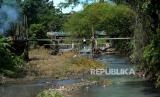 Kondisi jembatan Pucungrowol yang ambrol di Karangtengah, Kecamatan Imogiri, Bantul, Yogyakarta, Rabu (11/1/2023). Warga terpaksa membangun jembatan darurat dari bambu usai jembatan permanen Pucungrowol ambrol. Jembatan darurat ini dibangun secara swadaya dengan anggaran Rp 15 juta dan diprediksi akan selesai dalam tiga minggu. (FOTO : Republika/Wihdan Hidayat)