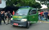 Mobil tahanan yang membawa Mantan Kapolda Sumatera Barat Irjen Teddy Minahasa beriap pergi usai proses pelimpahan berkas perkara tahap dua di Gedung Kejaksaan Negeri Jakarta Barat, Rabu (11/2/2023).Penyidik Ditresnarkoba Polda Metro Jaya menyerahkan Teddy Minahasa dan sejumlah tersangka lain serta barang bukti kepada Kejari Jakarta barat dalam pelimpahan tahap dua terkait kasus peredaran narkoba. (FOTO : Republika/Prayogi.)