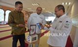 Direktur Operasi PT Bank Muamalat Indonesia Tbk Wahyu Avianto (kanan) didampingi oleh Direktur Kepatuhan Karno (kiri) dan Chief Human Capital Officer Riksa Prakoso (tengah) melakukan donasi menggunakan fitur QR Code pada aplikasi Muamalat DIN di kotak amal Masjid Al-Muamalah, Muamalat Tower, Jakarta, Kamis (12/1/2023). Fitur QR Code Muamalat DIN dapat digunakan di merchant-merchant yang terhubung dengan QRIS seperti toko ritel, SPBU hingga kotak amal. PT Bank Muamalat Indonesia Tbk terus memperluas implementasi penggunaan QR Code sebagai bagian dari upaya untuk meningkatkan penetrasi pembayaran nontunai. (FOTO : Republika/Prayogi)