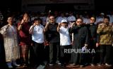 Menteri Agama Yaqut Cholil Qoumas (keempat kiri), Wakil Menteri Agama Zainut Tauhid (ketiga kiri) bersama sejumlah tokoh lintas agama berfoto bersama saat acara Jalan Sehat Kerukunan dan Deklarasi Damai Umat Beragama di Jakarta, Sabtu (14/1/2023). Acara jalan sehat tersebut diikuti oleh ribuan ASN Kementerian Agama dan sejumlah tokoh lintas agama dalam rangka memperingati Hari Amal Bhakti ke-77 Kementerian Agama. Selain itu, acara tersebut juga menggelar deklarasi dengan pesan penguatan moderisasi beragama serta meningkatkan kerukunan antar umat beragama. (FOTO : Republika/Thoudy Badai)