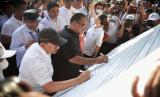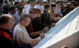 Tokoh lintas agama menandatangani papan deklarasi saat acara Jalan Sehat Kerukunan dan Deklarasi Damai Umat Beragama di Jakarta, Sabtu (14/1/2023). Acara jalan sehat tersebut diikuti oleh ribuan ASN Kementerian Agama dan sejumlah tokoh lintas agama dalam rangka memperingati Hari Amal Bhakti ke-77 Kementerian Agama. Selain itu, acara tersebut juga menggelar deklarasi dengan pesan penguatan moderisasi beragama serta meningkatkan kerukunan antar umat beragama. (FOTO : Republika/Thoudy Badai)