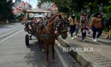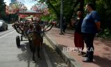 Penumpang menaiki delman di kawasan Monas, Jakarta, Ahad(15/1/2023).Penjabat (Pj) Gubernur DKI Heru Budi Hartono memastikan delman tidak dilarang digunakan di Jakarta. Namun Pemprov DKI membatasi pengoperasian delman hanya di sekitar kawasan Monumen Nasional (Monas),Jakpus pada saat akhir pekan, yakni Sabtu dan Ahad. (FOTO : Republika/Prayogi.)