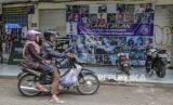 Seorang pengendara motor melintasi foto-foto korban tragedi di kawasan Stadion Kanjuruhan di Malang, Jawa Timur, Ahad (15/1/2023). Sidang perdana kasus Stadion Kanjuruhan akan dilaksanakan di Pengadilan Negeri Surabaya pada Senin (16/1/2023). Tragedi Stadion Kanjuruhan terjadi pada 1 Oktober 2022, saat berlangsungnya pertandingan antara Arema FC dan Persebaya. Sebanyak 135 orang meninggal dunia akibat tembakan gas air mata kepolisian ke tribun penonton yang menyebabkan kepanikan dan penonton saling berdesakan untuk menyelamatkan diri. (FOTO : EPA-EFE/MAST IRHAM)
