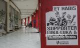 Grafiti duka cita dan simpati untuk para korban tragedi terlihat di kawasan Stadion Kanjuruhan di Malang, Jawa Timur, Ahad (15/1/2023). Sidang perdana kasus Stadion Kanjuruhan akan dilaksanakan di Pengadilan Negeri Surabaya pada Senin (16/1/2023). Tragedi Stadion Kanjuruhan terjadi pada 1 Oktober 2022, saat berlangsungnya pertandingan antara Arema FC dan Persebaya. Sebanyak 135 orang meninggal dunia akibat tembakan gas air mata kepolisian ke tribun penonton yang menyebabkan kepanikan dan penonton saling berdesakan untuk menyelamatkan diri. (FOTO : EPA-EFE/MAST IRHAM)
