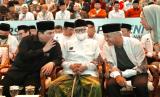 REPUBLIKA.CO.ID,SOLO -- Menteri BUMN Erick Thohir (kanan), Rais Aam PBNU Kiai Miftachul Akhyar (tengah), dan Gubernur Jawa Tengah Ganjar Pranowo (kiri) membunyikan terompet saat pembukaan Porseni NU di GOR Sritex Arena, Solo, Jawa Tengah, Senin (16/1/2023).