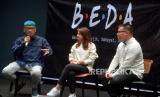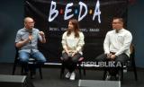 Komentator sepak bola Justinus Lhaksana (kiri) memberikan pandangan didampingi Co-Chair B.E.D.A Tsamara Amany (tengah) dan Pangeran Siahaan (kanan) saat memberikan keterangan pers di Jakarta, Rabu (18/1/2023). B.E.D.A yang merupakan sebuah gerakan anak muda yang mendorong berbagai inisiatif transformasi di masyarakat mendukung pencalonan Erick Thohir sebagai Ketua Umum PSSI Periode 2023-2027 untuk PSSI yang lebih baik. (FOTO : Republika/Prayogi.)
