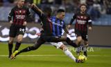 Pemain AC Milan Fikayo Tomori (kiri) berusaha menjegal pemain Inter Milan Lautaro Martinez dalam final Piala Super Italia 2022-2023 antara AC Milan dan Inter Milan di Stadion Universitas King Saud, di Riyadh, Arab Saudi, Kamis (19/1/2023)dini hari WIB. Inter Milan menang 3-0. (FOTO : (Foto AP/Hussein Malla))