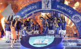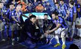 Inter Milan melakukan selebrasi setelah menerima piala saat memenangkan juara Piala Super Italia 2022-2023 usai mengalahkan AC Milan di Riyadh, Arab Saudi, Kamis (19/1/2023)dini hari WIB. Inter Milan menang 3-0. (FOTO : (Foto AP/Hussein Malla))