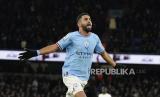 Riyad Mahrez merayakan setelah mencetak gol 4-2 pada pertandingan sepak bola Liga Premier Inggris antara Manchester City dan Tottenham Hotspur di Manchester, Inggris, Jumat, (20/1/2023) dini hari. (FOTO : EPA-EFE/Andrew Yates )