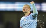 Erling Haaland merayakan golnya pada akhir pertandingan sepak bola Liga Premier Inggris antara Manchester City dan Tottenham Hotspur di Stadion Etihad di Manchester, Inggris, Jumat, (20/1/2023) dini hari. (FOTO : AP Photo/Dave Thompson)