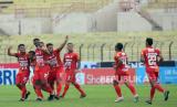 Pemain Bali United FC melakukan selebrasi usai mencetak gol ke gawang PSM Makassar pada lanjutan BRI Liga 1 di Stadion Sultan Agung, Yogyakarta, Jumat (20/1/2023). Hasil pertandingan ini Bali United FC harus puas berbagi poin dengan PSM Makassar usai bermain imbang 2-2. Gol Bali United FC dicetak oleh Eber Bessa dan Spasojevic, sedangkan gol PSM Makassar dicetak oleh Kenzo Nambu dan Yuran Fernandes. (FOTO : Republika/Wihdan Hidayat)
