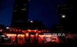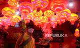 Warga etnis Tionghoa melintas di Vihara Amurva Bhumi saat perayaan malam Imlek di Jakarta, Sabtu (21/1/2023) malam. Pelaksanaan sembahyang malam tersebut dilaksanakan dalam rangka pergantian Tahun Baru Imlek 2574 menyambut tahun kelinci air. (FOTO : Republika/Putra M. Akbar)