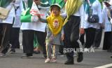 Anak-anak mengikuti Jalan Sehat Menuju 1 Abad NU di Pura Mangkunegaran, Surakarta, Jawa Tengah, Ahad (22/1/2023). Ribuan warga Nahdliyin mengikuti jalan sehat bersama Presiden Joko Widodo dan beberapa menteri. Selain untuk olahraga, kegiatan ini dalam rangka menyambut 1 Abad NU. (FOTO : Republika/Wihdan Hidayat)
