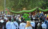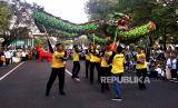 Rombongan barongsai ikut memeriahkan Jalan Sehat Menuju 1 Abad NU di Pura Mangkunegaran, Surakarta, Jawa Tengah, Ahad (22/1/2023). (FOTO : Republika/Wihdan Hidayat)