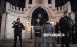 Pasukan polisi berjaga di sela aksi balasan pembakaran Quran dibalas dengan pembakaran bendera Swedia di depan Konjen Swediadi Istanbul, Turkey, Sabtu (21/1/2023). (FOTO : EPA-EFE/ERDEM SAHIN)