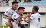 Pesepakbola Persita Tangerang Fergonzi (tengah) bersama rekan setimnya berselebrasi usai mencetak gol pada lanjutan BRI Liga 1 2022/2023 di Stadion Indomilk Arena, Tangerang, Banten, Ahad (22/1/2023). Dewa United mengalahkan Persita Tangerang dengan skor 3 - 2. (FOTO : Antara)
