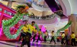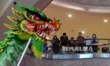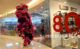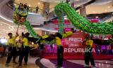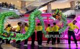 Grup Liong beratraksi menghibur pengunjung di Kuningan City Mall, Jakarta, Ahad (22/1/2023). Atraksi Barongsai dan liong yang digelar dengan berkeliling pusat perbelanjaan tersebut bertujuan untuk menghibur pengunjung sekaligus untuk menyambut Tahun Baru Imlek 2574. (FOTO : Republika/Prayogi.)