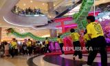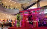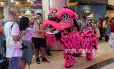 Pengunjung menyaksikan atraksi Grup Liong di Kuningan City Mall, Jakarta, Ahad (22/1/2023). Atraksi Barongsai dan liong yang digelar dengan berkeliling pusat perbelanjaan tersebut bertujuan untuk menghibur pengunjung sekaligus untuk menyambut Tahun Baru Imlek 2574. (FOTO : Republika/Prayogi.)
