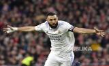 Karim Benzema berselebrasi setelah mencetak gol pembuka pada pertandingan sepak bola La Liga Spanyol antara Athletic Club Bilbao dan Real Madrid di stadion San Mames di Bilbao, Spanyol, Senin (23/1/2023) dini hari WIB. (FOTO : AP Photo/Alvaro Barrientos)