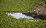Warga mengambil kayu dari Sungai Cipatik yang dipenuhi tanaman eceng gondok di Sasak Bubur, Cihampelas, Kabupaten Bandung Barat, Senin (23/1/2023). Warga setempat mengeluhkan banyaknya tanaman eceng gondok yang menutupi permukaan sungai tersebut karena mengganggu aktivitas perahu, pencari ikan serta keramba yang menjadi mata pencaharian sebagian warga di kawasan tersebut. (FOTO : ABDAN SYAKURA/REPUBLIKA)