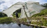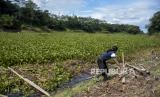 Warga memeriksa keramba ikan di Sungai Cipatik yang dipenuhi tanaman eceng gondok di Sasak Bubur, Cihampelas, Kabupaten Bandung Barat, Senin (23/1/2023). Warga setempat mengeluhkan banyaknya tanaman eceng gondok yang menutupi permukaan sungai tersebut karena mengganggu aktivitas perahu, pencari ikan serta keramba yang menjadi mata pencaharian sebagian warga di kawasan tersebut. (FOTO : ABDAN SYAKURA/REPUBLIKA)
