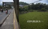 Kendaraan melintas di dekat Sungai Cipatik yang dipenuhi tanaman eceng gondok di Sasak Bubur, Cihampelas, Kabupaten Bandung Barat, Senin (23/1/2023). Warga setempat mengeluhkan banyaknya tanaman eceng gondok yang menutupi permukaan sungai tersebut karena mengganggu aktivitas perahu, pencari ikan serta keramba yang menjadi mata pencaharian sebagian warga di kawasan tersebut. (FOTO : ABDAN SYAKURA/REPUBLIKA)