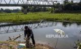 Warga memancing ikan di Sungai Cipatik yang dipenuhi tanaman eceng gondok di Sasak Bubur, Cihampelas, Kabupaten Bandung Barat, Senin (23/1/2023). Warga setempat mengeluhkan banyaknya tanaman eceng gondok yang menutupi permukaan sungai tersebut karena mengganggu aktivitas perahu, pencari ikan serta keramba yang menjadi mata pencaharian sebagian warga di kawasan tersebut. (FOTO : ABDAN SYAKURA/REPUBLIKA)