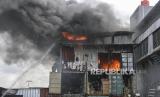 REPUBLIKA.CO.ID, SEMPER -- Api yang membakar gudang kabel fiber optik di kawasan Plumpang Semper Raya, Jakarta Utara, Senin (23/1/2023).