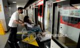 Petugas membatu penumpang dengan menggunakan kursi roda untuk menaiki Rangkaian kereta LRT di Stasiun Pegangsaan Dua Jakarta, Selasa (24/1/2023tu). LRT Jakarta melalui campaign #NyamankanJakarta mewujudkan pelayanan transportasi publik yang prima dengan menumbuhkan rasa aman, nyaman dan ramah lingkungan sehingga terciptanya transportasi publik yang ramah anak, ramah perempuan serta ramah disabilitas. Stasiun LRT Jakarta juga dilengkapi dengan berbagai fasilitas ramah difabel, ramah anak dan perempuan antara lain Toilet khusus Disabilitas, Pos Kesehatan dan Nursery Room, Pos Sahabat Perempuan dan Anak (SAPA), kursi roda yang disertai dengan ramp di setiap stasiun. (FOTO : Republika/Prayogi.)