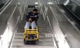 Petugas membatu penumpang dengan menggunakan kursi roda untuk menuruni tangga di Stasiun Pegangsaan Dua Jakarta, Selasa (24/1/2023tu). LRT Jakarta melalui campaign #NyamankanJakarta mewujudkan pelayanan transportasi publik yang prima dengan menumbuhkan rasa aman, nyaman dan ramah lingkungan sehingga terciptanya transportasi publik yang ramah anak, ramah perempuan serta ramah disabilitas. Stasiun LRT Jakarta juga dilengkapi dengan berbagai fasilitas ramah difabel, ramah anak dan perempuan antara lain Toilet khusus Disabilitas, Pos Kesehatan dan Nursery Room, Pos Sahabat Perempuan dan Anak (SAPA), kursi roda yang disertai dengan ramp di setiap stasiun. (FOTO : Republika/Prayogi.)
