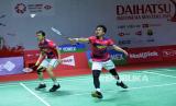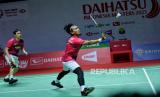 Pebulutangkis ganda putra Indonesia Mohammad Ahsan dan Hendra Setiawan saat bertanding melawan ganda putra Jepang Akira Koga dan Taichi Saito pada babak kualifikasi Daihatsu Indonesia Masters 2023 di Istora Gelora Bung Karno, Senayan, Jakarta, Selasa (24/1/2023).  (FOTO : Republika/Thoudy Badai)
