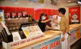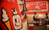 Pekerja melayani pembeli di gerai minuman dan es krim Mixue di Jalan Ampera, Jakarta, Selasa (24/1/2023). (FOTO : Republika/Thoudy Badai)
