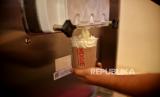 Pekerja memasukan bahan dasar es krim kedalam mesin di gerai minuman dan es krim Mixue di Jalan Ampera, Jakarta, Selasa (24/1/2023). (FOTO : Republika/Thoudy Badai)