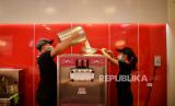 Pekerja membuat minuman es krim di gerai minuman dan es krim Mixue di Jalan Ampera, Jakarta, Selasa (24/1/2023). (FOTO : Republika/Thoudy Badai)